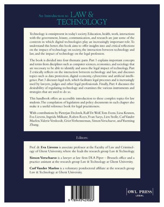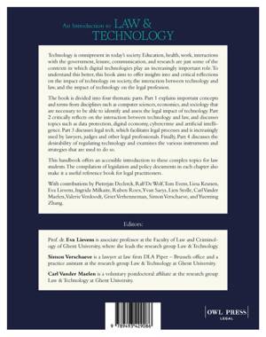 The book is divided into four thematic parts. Part 1 explains important concepts and terms from disciplines such as computer sciences, economics, and sociology. Part 2 critically reflects on the interaction between technology and law, and discusses topics such as data protection, e-commerce, and artificial intelligence. Part 3 discusses legal tech, and finally, part 4 discusses the desirability of regulating technology and examines the various instruments and strategies that are used to do so.