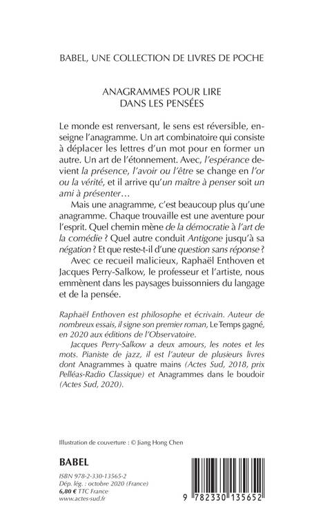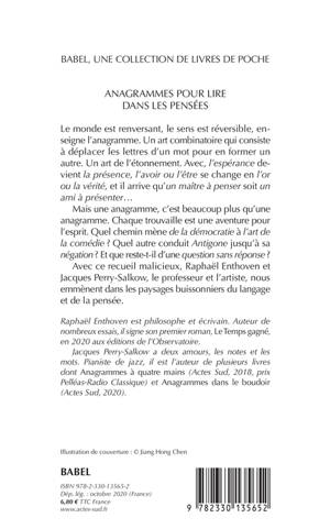 Le monde est renversant, le sens est réversible, enseigne l'anagramme. Un art combinatoire qui consiste à déplacer les lettres d'un mot pour en former un autre. Un art de l'étonnement. Avec, «l'espérance devient la présence, l'avoir ou l'être se change en l'or ou la vérité, et il arrive qu'un maître à penser soit un ami à présenter...»