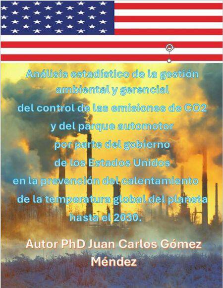 El cambio climático es uno de los mayores desafíos que enfrenta la humanidad en el siglo XXI. Entre los principales responsables de este fenómeno se encuentra Estados Unidos, el segundo emisor de dióxido de carbono (CO2) del mundo, después de China. En 2021 emitió 4.752 megatoneladas de CO2 lo que representa el 15% de las emisiones globales. Estas emisiones provienen principalmente del sector energético, el transporte, la industria y la agricultura. Esta investigación realizó una caracterización de las variable emisiones de CO2 y parque automotor , se le aplico a los datos una prueba de normalidad mediante el análisis de Shapiro Wilk, una prueba de correlación de Pearson que dio como resultado una correlación fuerte de r=-0.89 Dado que el valor de r es negativo, indica una relación negativa entre las variables, esto debido a una leve tendencia a la baja de las emisiones de CO2 en los últimos años y a un incremento constante del parque automotor en el país; Utilizando el modelo de mínimos cuadrados, se realizó una proyección de las emisiones de CO2 en Estados Unidos desde el año 2024 hasta el 2030. Los resultados indican que, si bien se espera una reducción gradual de las emisiones, pasando de 4.530,6 Mt en 2024 a 4.124,0 Mt en 2030, este ritmo de disminución es insuficiente para alcanzar las metas globales de limitar el calentamiento global a 1,5°C. La situación se agrava aún más si se considera que en 2023 la temperatura global ya alcanzó los 1,48°C, lo que provocó olas de calor extremas, muertes y diversas anomalías climáticas en todo el planeta.