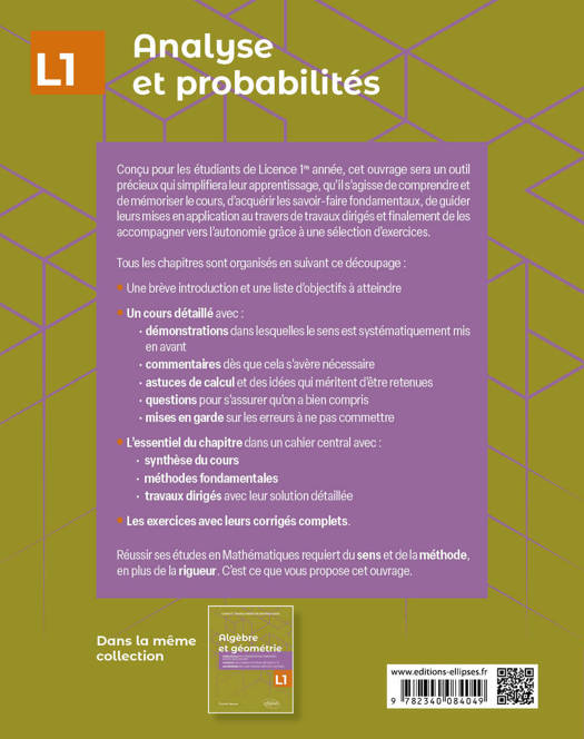 Conçu pour les étudiants de Licence 1re année, cet ouvrage sera un outil précieux qui simplifiera leur apprentissage, qu’il s’agisse de comprendre et de mémoriser le cours, d’acquérir les savoirs faire fondamentaux, de guider leurs mises en application au travers de travaux dirigés et finalement de les accompagner vers l’autonomie grâce à une sélection d’exercices.