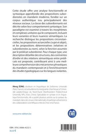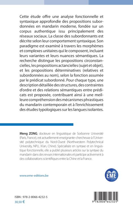 Cette étude offre une analyse fonctionnelle et syntaxique approfondie des propositions subordonnées en mandarin moderne, fondée sur un corpus authentique issu principalement des réseaux sociaux. La classe des subordonnants est décrite selon leur comportement syntaxique. Son paradigme est examiné à travers les morphèmes et complexes unitaires qui le composent, incluant leurs variantes et leurs nuances sémantiques. La recherche distingue les propositions circonstancielles, les propositions actancielles (sujet et objet), et les propositions déterminatives (relatives et subordonnées au nom), selon la fonction assumée par le prédicat subordonné. Pour chaque type, une description détaillée des structures, des contraintes d'ordre et des relations sémantiques entre prédicats est proposée, contribuant ainsi à une meilleure compréhension des mécanismes phrastiques du mandarin contemporain et à l'enrichissement des études typologiques sur les langues isolantes.