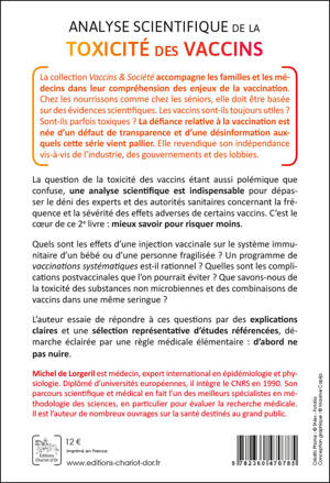 La question de la toxicité des vaccins étant aussi polémique que confuse, une analyse scientifique est indispensable pour dépasser le déni des experts et des autorités sanitaires concernant la fréquence et la sévérité des effets adverses de certains vaccins. C’est le coeur de ce deuxième livre : mieux savoir pour risquer moins. Quels sont les effets d’une injection vaccinale sur le système immunitaire d’un bébé ou d’une personne fragilisée ? Un programme de vaccinations systématiques est-il rationnel ? Quelles sont les complications postvaccinales que l’on pourrait éviter ? Que savons-nous de la toxicité des substances non microbiennes et des combinaisons de vaccins dans une même seringue ? L’auteur essaie de répondre à ces questions par des explications claires et une sélection représentative d’études référencées, démarche éclairée par une règle médicale élémentaire : d’abord ne pas nuire. La collection ''Vaccins & Société'' accompagne les familles et les médecins dans leur compréhension des enjeux de la vaccination. Chez les nourrissons comme chez les seniors, elle doit être basée sur des évidences scientifiques. Les vaccins sont-ils toujours utiles ? Sont-ils parfois toxiques ? La défiance relative à la vaccination est née d’un défaut de transparence et d’une désinformation auxquels cette série vient pallier. Elle revendique son indépendance vis-à-vis de l’industrie, des gouvernements et des lobbies.