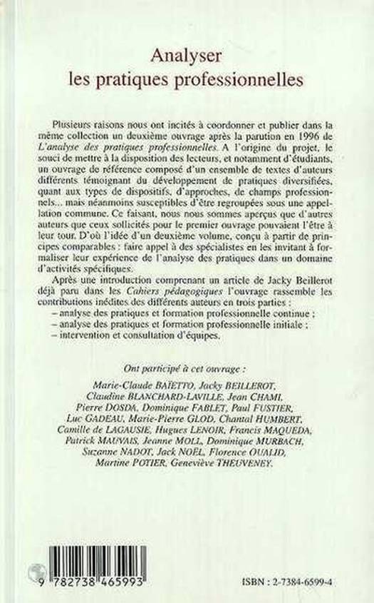 Cet ouvrage regroupent des contributions de différents auteurs autour de trois thèmes : analyse des pratiques et formation professionnelle continue ; analyse des pratiques et formation professionnelle initiale ; intervention et consultation d'équipes.