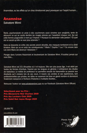 Marie, psychanalyste en proie à des cauchemars aussi sinistres que sanglants, tente de découvrir ce qui se cache derrière les images atroces qui l’assaillent chaque nuit. Qui est cette femme poignardée à mort qui l’implore ? Pourquoi lui demande-t-elle pardon ? Et quel est ce secret qu’elle ne veut plus entendre ? Dans sa descente en enfer, des secrets seront dévoilés, des masques tomberont et la vérité éclatera. Mais qui va en subir les conséquences ? Marie ? Sophie ? Luc ? Ou encore Jack Lee dont Marie est devenue l’obsession ? Plongez dans l’univers frissonnant et bouleversant de Salvatore Minni. N’oubliez jamais qui vous êtes... Ouvrage sélectionné pour les Prix : Prix Découverte Noir Charbon 2019 - Prix des Lecteurs Club 2019 - Prix Soleil Noir Jaune Rouge 2019.