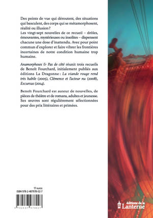 Anamorphoses & Pas de côté réunit trois recueils de Benoît Fourchard, initialement publiés aux éditions La Dragonne : La viande rouge rend très habile (2005), Clémence et l’acteur nu (2008), Excursus (2014).