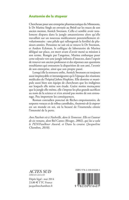 Scientifique et chercheuse pour une entreprise pharmaceutique du Minnesota, le Dr Marina Singh est envoyée au Brésil sur les traces de son ancien mentor, le Dr Annick Swenson. Celle-ci semble avoir totalement disparu dans la jungle amazonienne alors qu'elle travaillait sur un nouveau médicament d'une extrême importance (une pilule qui allongerait la fertilité de plusieurs années), tandis qu'un collègue et ami de Marina, qui l'avait précédée, est mort dans de mystérieuses circonstances... Variation moderne sur Au cœur des ténèbres de Conrad, Anatomie de la stupeur est un roman sombre et magnifique, où la beauté de l'inattendu côtoie l'insondabilité de la perte.