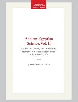 The 2nd of 3 vols. by Prof. Marshall Clagett on Ancient Egyptian Science. Contents: Part I: Intro. to Egyptian Calendars; Parker's Account of the Old Lunar Calendar; The Later Lunar Calendar; The Origin of the Civil Calendar; Sothic Dates & the Ebers Calendar; The Night Hours; Decanal Clocks; Transit Decanal Clocks; The Ramesside Star Clock; Outflow Water Clocks; Inflow Water Clocks; Shadow Clocks; Egyptian Sundials; Traces of a 24-hour Day with Equal Hours; Astronomical Ceilings & Other Monuments; The Ceiling of the Secret Tomb of Senmut; The Vaulted Ceiling of Hall K in Seti I's Tomb; Egyptian Zodiacs. Part II: Documents. Part III: Bibliography & Indexes. Part IV: Illustrations.