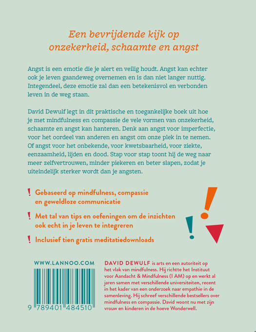 David Dewulf legt in dit praktische en toegankelijke boek uit hoe je met mindfulness en compassie de vele vormen van onzekerheid, schaamte en angst kan hanteren. Denk aan angst voor imperfectie, voor het oordeel van anderen en angst om onze plek in te nemen. Of angst voor het onbekende, voor kwetsbaarheid, voor ziekte, eenzaamheid, lijden en dood. Stap voor stap toont hij de weg naar meer zelfvertrouwen, minder piekeren en beter slapen, zodat je uiteindelijk sterker wordt dan je angsten.