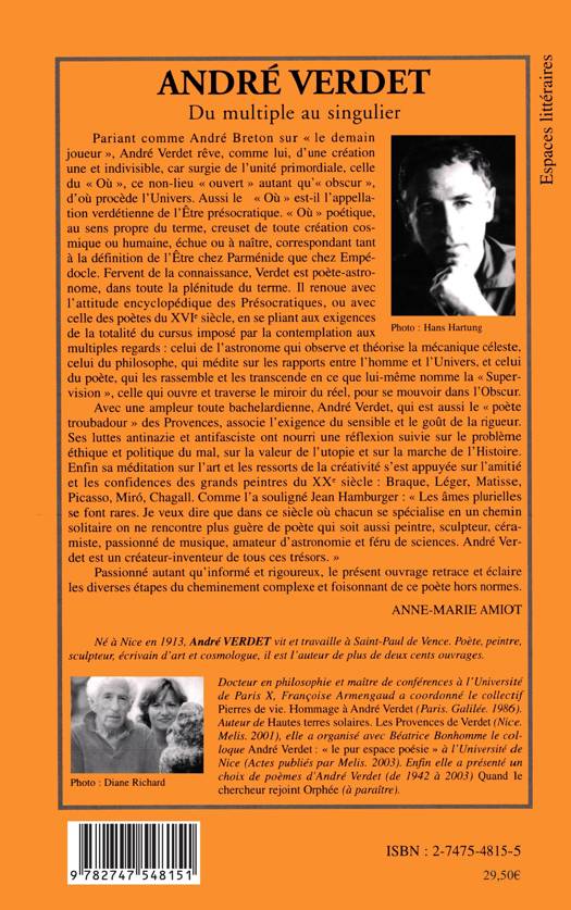 Le présent ouvrage retrace et éclaire les diverses étapes du cheminement complexe et foisonnant de ce poète hors normes. Egalement ""poète troubadour"" des Provences, André Verdet associe l'exigence du sensible et le goût de la rigueur. Ses luttes antinazie et antifascistes ont nourri une réflexion suivie sur le problème éthique et politique du mal, sur la valeur de l'Utopie et sur la marche de l'Histoire. Enfin sa méditation sur l'art et les ressorts de la créativité s'est appuyée sur l'amitié et les confidences des grands peintres du XXe siècle : Braque, Léger, Matisse, Picasso, Miro, Chagall.