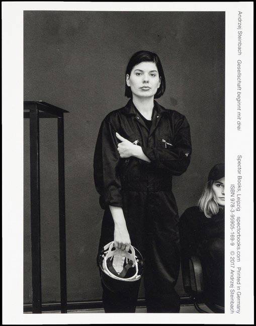 Im Jahr 2015 erschien von Andrzej Steinbach der Fotoband Figur I, Figur II, in dem zwei Frauen porträtiertwurden. In seinem neuen Buch erweitert er den Personenkreis, um sich fotografisch mit der Frage auseinanderzusetzen:Warum sollte man binären Ordnungsschemata misstrauen und sich Figurationen des Drittenzuwenden? Als fotografischer Ausgangspunkt dient Steinbach das klassische Format des Gruppenbildesbzw. des Familienporträts. Alle beteiligten Figuren schauen in Richtung Kamera und blicken zumBetrachter hin. Aber im Bildmittelpunkt ist immer nur eine Person zu sehen, die anderen sind angeschnitten.In der Serie wechseln die Modelle ihre Positionen und auch die Kleidung, so dass ein Verwirrspiel entstehtund die Dreierkonstellation immer wieder aus der Ordnung gerät. Der Titel Gesellschaft beginnt mitdrei lehnt sich an den gleichnamigen Essay von Ulrich Bröckling an und ist Steinbachs gelungene fotografischeUmsetzung dieses Gedankens.