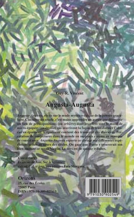 Angusta-Augusta, récits sur le mode mythico-épique de la pensée oraculaire. Consulter un oracle, c'est moins apprendre un avenir que découvrir un lieu de prédispositions (ou orbière) dont les effets sont le motif de micro-épopées (ou épyllia) qui inscrivent la façon de transformer l'obscur en épaisseur. L'épaisseur contient des trames et des clairières. Percolation de conjectures dans le monde en surpoids comme en manque de consistance. Angusta-Augusta reporte ce clivage sur différentes expériences prises au cours des siècles. On gage que Dante y trouverait son bien, ensuite ce serait Virgile. Le vers est de quinze syllabes. Le peintre François de Asis a permis de reproduire, en couverture, sa peinture intitulée Sur la terrasse.