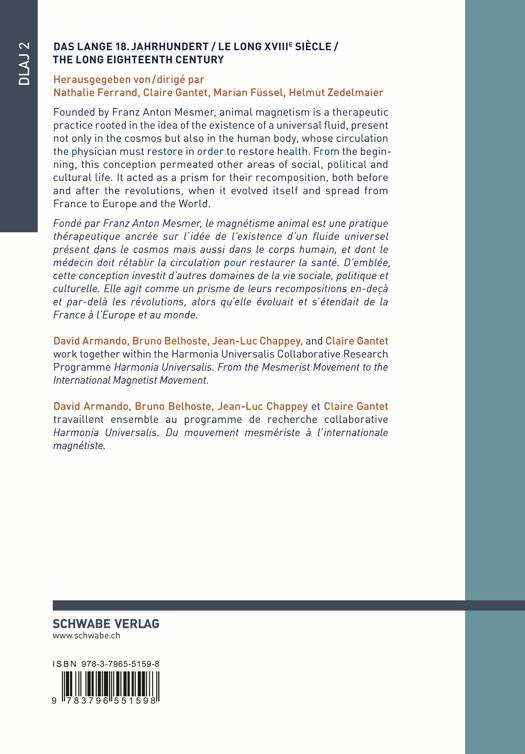 Founded by Franz Anton Mesmer, animal magnetism is a therapeutic practice rooted in the idea of the existence of a universal fluid, present not only in the cosmos but also in the human body, whose circulation the therapist must restore in order to restore health. From the beginning, this conception permeated other areas of social, political and cultural life. It acted as a prism for their recomposition, both before and after the revolutions, when it evolved itself and spread from France to Europe and the World.Fondé par Franz Anton Mesmer, le magnétisme animal est une pratique thérapeutique ancrée sur l'idée de l'existence d'un fluide universel présent dans le cosmos mais aussi dans le corps humain, et dont le thérapeute doit rétablir la circulation pour restaurer la santé. D'emblée, cette conception investit d'autres domaines de la vie sociale, politique et culturelle. Elle agit comme un prisme de leurs recompositions en-deçà et par-delà les révolutions, alors qu'elle évoluait et s'étendait de la France à l'Europe et au monde.