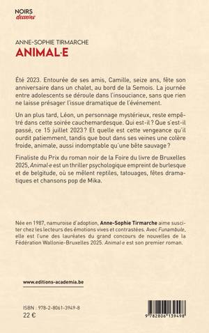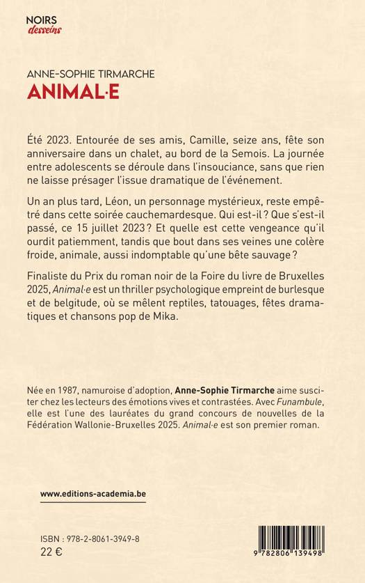 Finaliste du Prix du Roman noir de la Foire du Livre de Bruxelles 2025, Animal-e est un thriller psychologique empreint de burlesque et de belgitude, où se mêlent reptiles, tatouages, fêtes dramatiques et chansons pop de Mika.