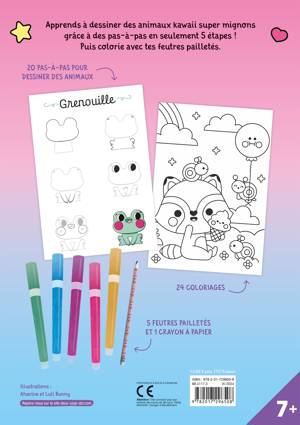 Un cahier de 96 pages contenant 20 pas-à-pas pour apprendre à dessiner des animaux kawaii super mignons (un chat, une licorne, une grenouille, un hamster...). Sur la page de gauche se trouve le pas-à-pas en 5 étapes, la 6e étape étant l'animal terminé et en couleur. À droite, une page vierge permet à l'enfant de dessiner grâce à un crayon à papier charté, avec une gomme au bout, tout en suivant les étapes. + 24 coloriages kawaii et 5 feutres pailletés (rose, violet, doré, vert clair et bleu clair). Les feutres et le crayon à papier sont rangés dans une pochete collée au plat III de la couverture cartonnée.
