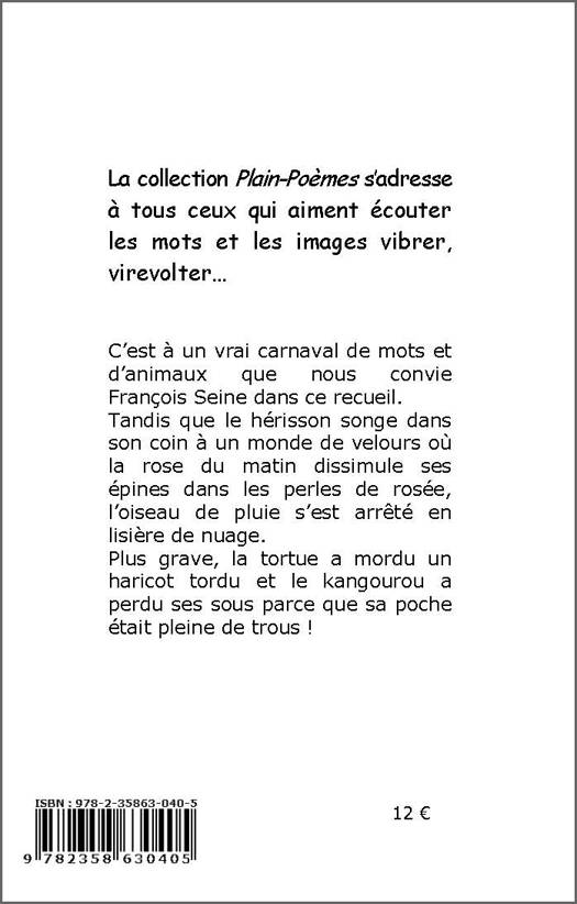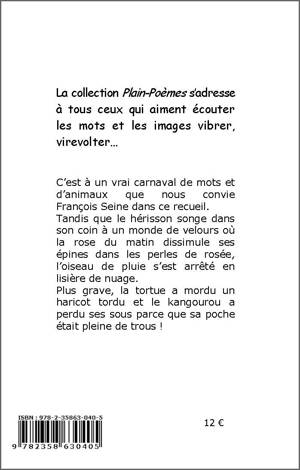 La collection Plain-Poèmes s’adresse à tous ceux qui aiment écouter les mots et les images vibrer, virevolter… C’est à un vrai carnaval de mots et d’animaux que nous convie François Seine dans ce recueil, dont un poème, "le dodo", a été traduit en créole réunionnais.Tandis que le hérisson songe dans son coin à un monde de velours où la rose du matin dissimule ses épines dans les perles de rosée, l’oiseau de pluie s’est arrêté en lisière de nuage.Plus grave, la tortue a mordu un haricot tordu et le kangourou a perdu ses sous parce que sa poche était pleine de trous ! Illustrations de Cécile Froidurot - traduction du dodo par Henriette Dijoux