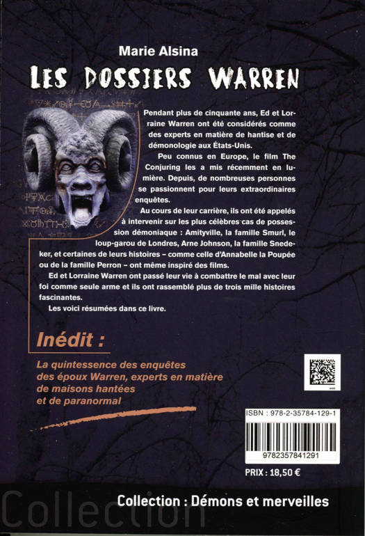 Pendant plus de cinquante ans, Ed et Lorraine Warren ont été considérés comme des experts en matière de hantise et de démonologie aux États-Unis. Peu connus en Europe, le film ''The Conjuring'' les a mis récemment en lumière. Depuis, de nombreuses personnes se passionnent pour leurs extraordinaires enquêtes. Au cours de leur carrière, ils ont été appelés à intervenir sur les plus célèbres cas de possession démoniaque : Amityville, la famille Smurl, le loup-garou de Londres, Arne Johnson, la famille Snedeker, et certaines de leurs histoires - comme celle d'Annabelle la poupée ou de la famille Perron - ont même inspiré des films. Ed et Lorraine Warren ont passé leur vie à combattre le mal avec leur foi comme seule arme et ils ont rassemblé plus de trois milles histoires fascinantes. Les voici résumées dans ce livre.