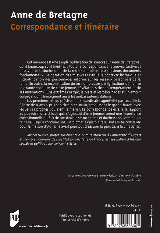 Cet ouvrage est une ample publication de sources sur Anne de Bretagne, dont beaucoup sont inédites : toute la correspondance retrouvée (active et passive, de la duchesse et de la reine) complétée par plusieurs documents fondamentaux. La datation des missives restitue le contexte historique et l'identification des personnages informe sur les réseaux personnels de la reine. En outre, la reconstitution de ses nombreuses pérégrinations démontre la grande mobilité de cette femme, révélatrices de son tempérament et de ses motivations : une extrême énergie, la piété et les pèlerinages et un amour conjugal dont témoignent aussi les ambassadeurs italiens.