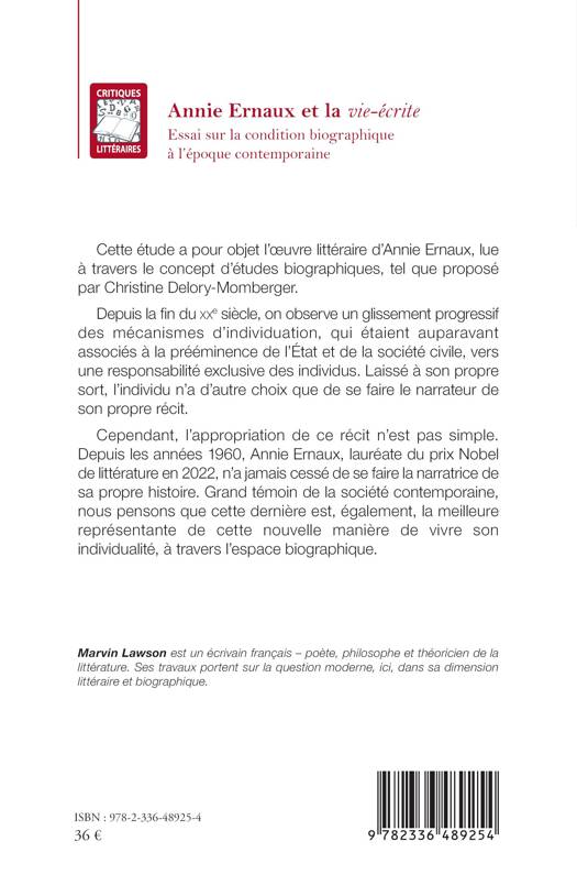 Cette étude a pour objet l’œuvre littéraire d’Annie Ernaux, lue à travers le concept d’études biographiques, tel que proposé par Christine Delory-Momberger. Depuis la fin du XXe siècle, on observe un glissement progressif des mécanismes d’individuation, qui étaient auparavant associés à la prééminence de l’État et de la société civile, vers une responsabilité exclusive des individus. Laissé à son propre sort, l’individu n’a d’autre choix que de se faire le narrateur de son propre récit. Cependant, l’appropriation de ce récit n’est pas simple. Depuis les années 1960, Annie Ernaux, lauréate du prix Nobel de littérature en 2022, n’a jamais cessé de se faire la narratrice de sa propre histoire. Grand témoin de la société contemporaine, nous pensons que cette dernière est, également, la meilleure représentante de cette nouvelle manière de vivre son individualité, à travers l’espace biographique.