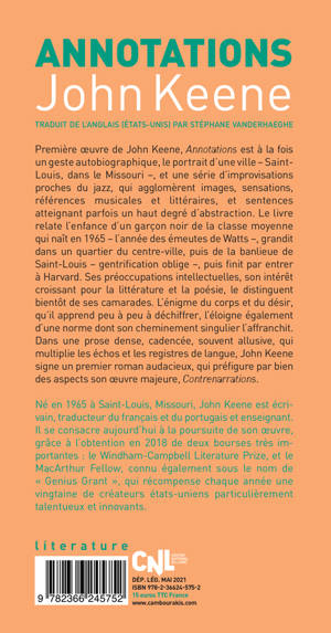 Après «Contrenarrations», la première oeuvre de John Keene, «Annotations» est à la fois un geste autobiographique, le portrait d'une ville (Saint-Louis, dans le Missouri), et une série d'improvisations proches du jazz qui agglomèrent images, sensations, références musicales et littéraires. Une des voix les plus puissantes et innovantes de la littérature afro-américaines d'aujourd'hui.