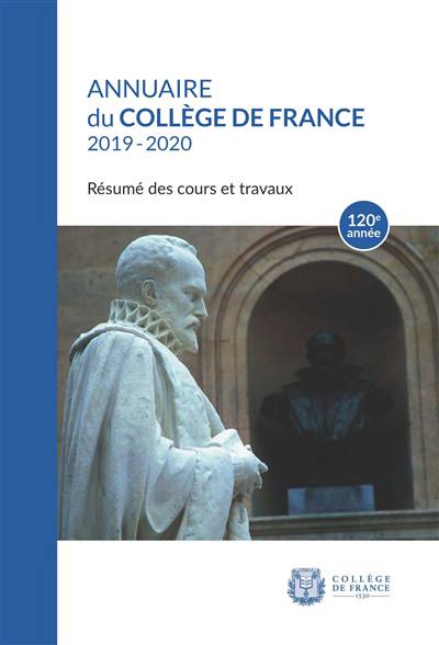 La 120e édition de l'Annuaire du Collège de France reflète l'activité scientifique de l'institution pour l'année académique 2019-2020. Elle contient notamment les résumés détaillés des enseignements ainsi qu'une présentation des recherches menées par les professeurs du Collège de France, leurs laboratoires et équipes de recherche.