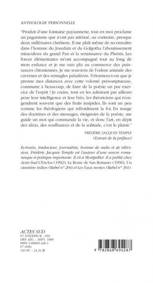 "Produit d'une lointaine paysannerie, tout en moi proclame un paganisme que n'ont pas atténué, au contraire, presque deux millénaires chrétiens. Il me plaît même de reconnaître dans l'homme du Jourdain et du Golgotha l'aboutissement miraculeux du grand Pan et la renaissance du Phénix. Les forces élémentaires m'ont accompagné tout au long de mon enfance et je me suis plu au commerce des puissances chtoniennes. Je me souviens de l'odeur animale des cavernes et des remugles paludéens. S'étonnera-t-on que je prenne mes distances avec cette volonté présomptueuse, commune à beaucoup, de faire de la poésie un pur exercice de l'esprit ? Je crains, tout en les admirant par ailleurs pour leur intelligence et leur brio, les théoriciens qui n'engendrent souvent que des fruits insipides. Ils sont un peu comme les théologiens qui refroidissent la foi. En marge des doctrines et des messages, éteignoirs de la poésie, me guide un mot qui commande la vie, et donc l'art, en dépit des aléas, des souffrances et de la solitude, c'est le plaisir."