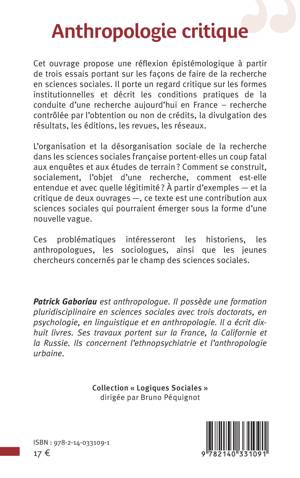 Cet ouvrage propose une réflexion épistémologique à partir de trois essais portant sur les façons de faire de la recherche en sciences sociales. Il porte un regard critique sur les formes institutionnelles et décrit les conditions pratiques de la conduite d'une recherche aujourd'hui en France – recherche contrôlée par l'obtention ou non de crédits, la divulgation des résultats, les éditions, les revues, les réseaux. L'organisation et la désorganisation sociale de la recherche dans les sciences sociales française portent-elles un coup fatal aux enquêtes et aux études de terrain ? Comment se construit, socialement, l'objet d'une recherche, comment est-elle entendue et avec quelle légitimité ? À partir d'exemples et la critique de deux ouvrages , ce texte est une contribution aux sciences sociales qui pourraient émerger sous la forme d'une nouvelle vague. Ces problématiques intéresseront les historiens, les anthropologues, les sociologues, ainsi que les jeunes chercheurs concernés par le champ des sciences sociales.