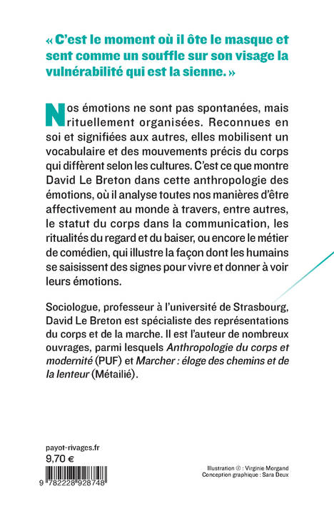 Nos émotions ne sont pas spontanées, mais rituellement organisées. Reconnues en soi et signifiées aux autres, elles mobilisent un vocabulaire et des mouvements précis du corps qui diffèrent selon les cultures. C'est ce que montre David Le Breton dans cette anthropologie des émotions, où il analyse toutes nos manières d'être affectivement au monde à travers, entre autres, le statut du corps dans la communication, les ritualités du regard et du baiser, ou encore le métier de comédien, qui illustre la façon dont les humains se saisissent des signes pour vivre et donner à voir leurs émotions.