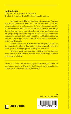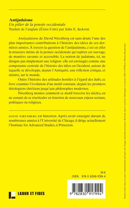 Antijudaïsme de David Nirenberg est sans doute l’une des plus importantes contributions à l’histoire des idées de ces dernières années. À travers la question de l’antijudaïsme c’est en effet la structure même de la pensée occidentale qui est explorée, de manière savante et accessible. La notion de judaïsme, ici, ne désigne pas simplement une religion : elle est envisagée comme une composante centrale de la pensée occidentale, autour de laquelle se développe, depuis l’antiquité, une réflexion critique, et sinistre, sur le monde. Outre l’histoire des attitudes hostiles à l’égard des Juifs, ce livre montre comment se développe un motif constant, depuis les premiers théologiens chrétiens jusqu’aux philosophes modernes. Nirenberg montre comment ce motif traverse les siècles, en ne cessant de se réarticuler en fonction des enjeux sociaux, politiques ou religieux.