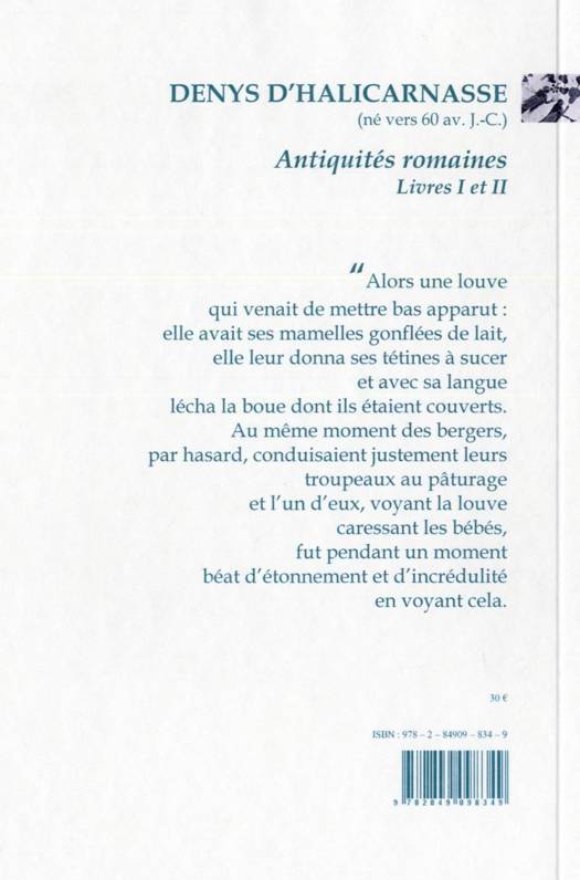 Alors une louve qui venait de mettre bas apparut : elle avait ses mamelles gonflées de lait, elle leur donna ses tétines à sucer et avec sa langue lécha la boue dont ils étaient couverts. Au môme moment des bergers, par hasard, conduisaient justement leurs troupeaux au pâturage et l'un d'eux, voyant la louve caressant les bébés, fut pendant un moment béat d'étonnement et d'incrédulité en voyant cela.