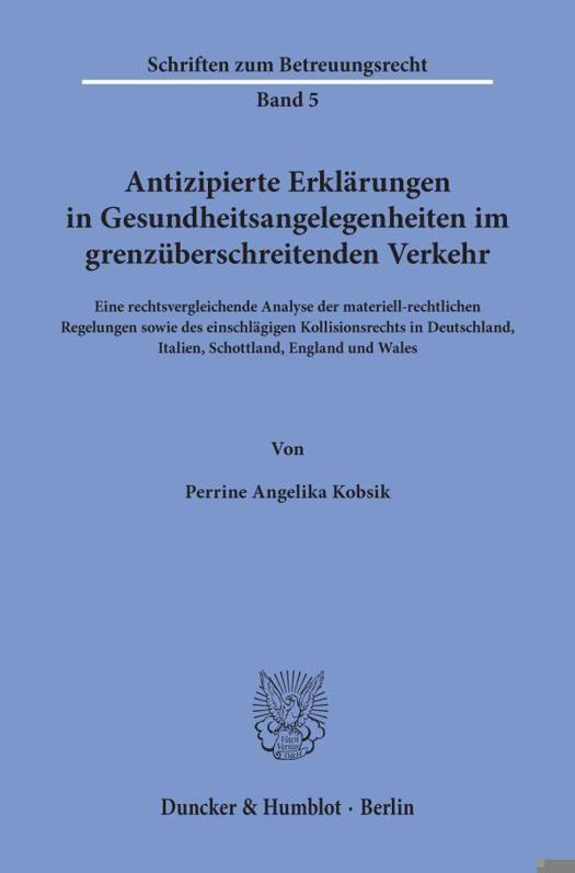 Ausgehend von der Darstellung der Grundlagen des Einwilligungserfordernisses zu medizinischen Behandlungen, untersucht Perrine Kobsik zunachst das materielle Recht von Deutschland, Italien, Schottland, England und Wales im Hinblick darauf, wie die medizinisch-therapeutische Selbstbestimmung durch antizipierte Erklarungen nach Art einer Betreuungsverfugung, Vorsorgevollmacht oder Patientenverfugung verwirklicht werden kann. Anschlieaend wird die kollisionsrechtliche Behandlung der zuvor dargestellten Rechtsinstitute betrachtet. Die Verfasserin gelangt zu dem differenzierten Fazit, dass sich das anwendbare Recht fur Betreuungsverfugungen und Vorsorgevollmachten nach dem Haager Erwachsenenschutzubereinkommen, fur Patientenverfugungen dagegen sachgerecht nach der Rom I- bzw. Rom II-VO bestimmen lasst, weshalb hierfur keine neuen Kollisionsnormen geschaffen werden mussten, gleichwohl jedoch eine den Erwachsenenschutz und all diese Erklarungen erfassende europaische Verordnung wunschenswert ware.