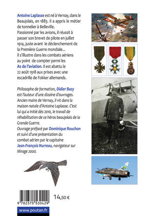 Philosophe de formation, Didier Bazy est l’auteur d’une dizaine d’ouvrages. Ancien maire de Vernay, il vit dans la maison natale d’Antoine Laplasse. Il a initié un travail de réhabilitation de ce héros beaujolais de la Grande Guerre. Ouvrage préfacé par Dominique Rouchon et suivi d’une présentation du combat aérien par le capitaine Jean-François Hurreau, navigateur sur Mirage 2000.