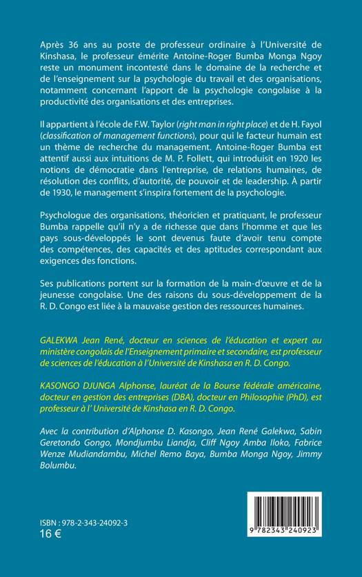 Après 36 ans au poste de professeur ordinaire à l'Université de Kinshasa, le professeur émérite Antoine-Roger Bumba Monga Ngoy reste un monument incontesté dans le domaine de la recherche et de l'enseignement sur la psychologie du travail et des organisations, notamment concernant l'apport de la psychologie congolaise à la productivité des organisations et des entreprises. Le professeur Bumba rappelle qu'il n'y a de richesse que dans l'homme et que les pays sous-développés le sont devenus faute d'avoir tenu compte des compétences, des capacités et des aptitudes correspondant aux exigences des fonctions.