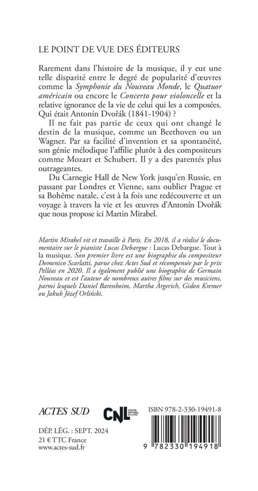 Rarement dans l'histoire de la musique, il y eut une telle disparité entre le degré de popularité d'oeuvres comme la Symphonie du Nouveau Monde, le Quatuor américain ou encore le Concerto pour violoncelle et la relative ignorance de la vie de celui qui les a composées. Qui était Antonín Dvorák (1841-1904) ? Il ne fait pas partie de ceux qui ont changé le destin de la musique, comme un Beethoven ou un Wagner. Par sa facilité d'invention et sa spontanéité, son génie mélodique l'affilie plutôt à des compositeurs comme Mozart et Schubert. Il y a des parentés plus outrageantes. Du Carnegie Hall de New York jusqu'en Russie, en passant par Londres et Vienne, sans oublier Prague et sa Bohême natale, c'est à la fois une redécouverte et un voyage à travers la vie et les oeuvres d'Antonín Dvorák que nous propose ici Martin Mirabel.