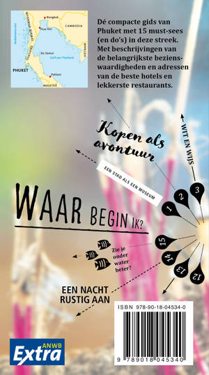 ANWB Extra reisgids Phuket – Thailand Beleef Phuket met de compleet vernieuwde reisgids ANWB Extra Phuket! Het heerlijke klimaat, de indrukwekkende cultuur, de vrolijke chaos in de stad. Maar ook de rust aan de stranden en natuurlijk de vriendelijke, goedlachse inwoners van het land. Van backpacker tot luxedier, iedereen vindt in Thailand zijn droombestemming. De ANWB Extra reisgids Phuket biedt naast veel praktische tips over vakantiehuizen, hotels en vervoer ook 15 inspirerende bezienswaardigheden die je niet mag missen. Ga kajakken door de Phang Nga Bay, slenter over de Naka Weekend Market of wandel door de wildernis van nationaal park Khao Phra Thaeo.