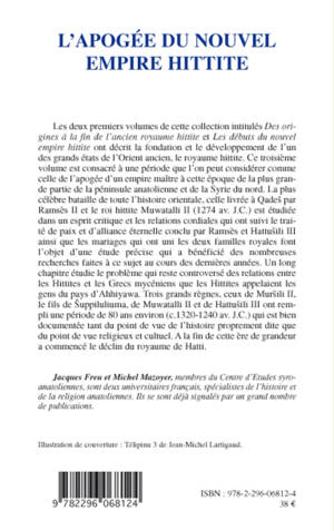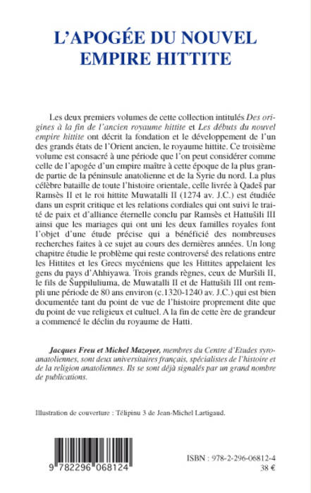 Deux volumes : Des origines à la fin de l'ancien royaume hittite et Les débuts du nouvel empire hittite ont décrit la fondation et le développement de l'un des grands états de l'Orient ancien. Ce troisième volume est consacré à la période de l'apogée d'un empire alors maître de la plus grande partie de la péninsule anatolienne et de la Syrie du Nord.