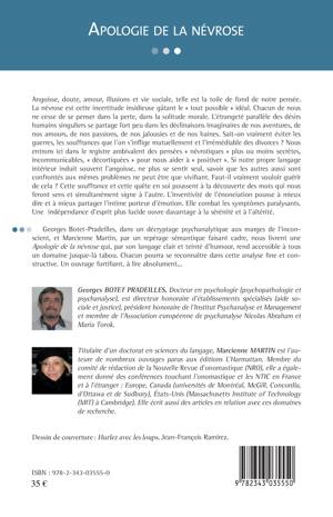 Georges Botet-Pradeilles, dans un décryptage psychanalytique aux marges de l'inconscient, et Marcienne Martin, par un repérage sémantique faisant cadre, nous livrent une Apologie de la névrose qui, par son langage clair et teinté d'humour, rend accessible à tous un domaine jusque-là tabou. Chacun pourra se reconnaître dans cette analyse fine et constructive. Un ouvrage fortifiant, à lire absolument...