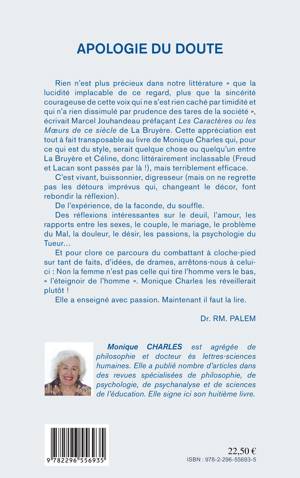 Monique Charles qui, pour ce qui est du style, serait quelqu'un entre La Bruyère et Céline, donc littérairement inclassable, mais terriblement efficace. C'est vivant, buissonnier, digressseur. De l'expérience, de la faconde, du souffle. Des réflexions intéressantes sur le deuil, l'amour, les rapports entre les sexes, le couple, le mariage, le problème du Mal , la douleur, le désir, les passions, la psychologie du Tueur...