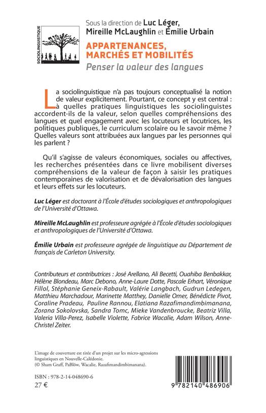 La sociolinguistique n'a pas toujours conceptualisé la notion de valeur explicitement. Pourtant, ce concept y est central: à quelles pratiques linguistiques les sociolinguistes accordent-ils de la valeur, selon quelles compréhensions des langues et quel engagement avec les locuteurs et locutrices, les politiques publiques, le curriculum scolaire ou le savoir même ? Quelles valeurs sont attribuées aux langues par les personnes qui les parlent ? Qu'il s'agisse de valeurs économiques, sociales ou affectives, les recherches présentées dans ce livre mobilisent diverses compréhensions de la valeur de façon à saisir les pratiques contemporaines de valorisation et de dévalorisation des langues et leurs effets sur les locuteurs.