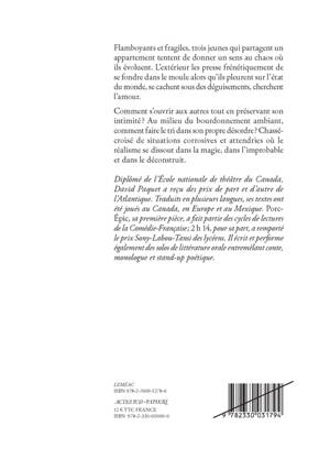 «Diplômé de l'Ecole nationale de théâtre du Canada, David Paquet a reçu des prix de part et d'autre de l'Atlantique. Traduits en plusieurs langues, ses textes ont été joués au Canada, en Europe et au Mexique. »Porc-épic«, sa première pièce, a fait partie des cycles de lectures de la Comédie-Française ; »2 h 14«, pour sa part, a remporté le prix Sony-Labou-Tansi des lycéens. Il écrit et performe également des solos de littérature orale entremêlant conte, monologue et stand-up poétique.»