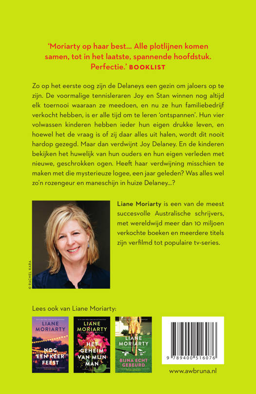 Zo op het eerste oog zijn de Delaneys een gezin om jaloers op te zijn. De voormalige tennisleraren Joy en Stan winnen nog altijd elk toernooi waaraan ze meedoen, en nu ze hun familiebedrijf verkocht hebben, is er alle tijd om te leren ‘ontspannen’. Hun vier volwassen kinderen hebben ieder hun eigen drukke leven, en hoewel het de vraag is of zij daar alles uit halen, wordt dit nooit hardop gezegd. Maar dan verdwijnt Joy Delaney. En de kinderen bekijken het huwelijk van hun ouders en hun eigen verleden met nieuwe, geschrokken ogen. Heeft haar verdwijning misschien te maken met die mysterieuze logee, een jaar geleden? Was alles wel zo’n rozengeur en maneschijn in huize Delaney…?