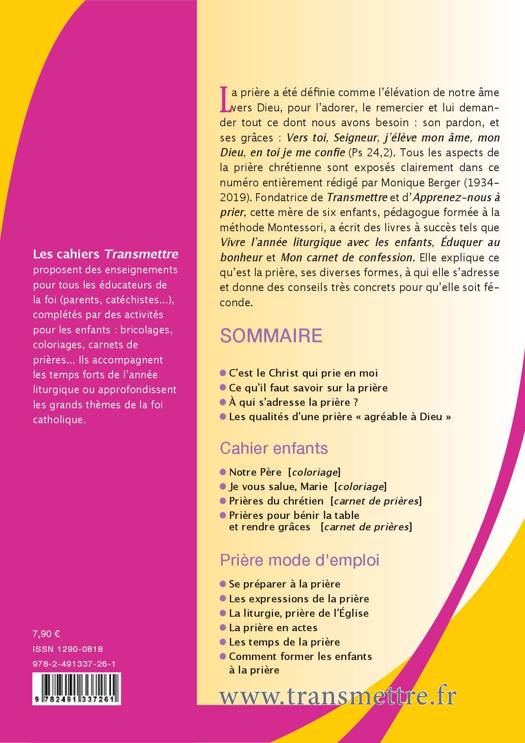 La prière a été définie comme l’élévation de notre âme vers Dieu, pour l’adorer, le remercier et lui demander tout ce dont nous avons besoin : son pardon, et ses grâces : Vers toi, Seigneur, j’élève mon âme, mon Dieu, en toi je me confie (Ps 24,2). Tous les aspects de la prière chrétienne sont exposés clairement dans ce numéro entièrement rédigé par Monique Berger (1934-2019). Fondatrice de Transmettre et d’Apprenez-nous à prier, cette mère de six enfants, pédagogue formée à la méthode Montessori, a écrit des livres à succès tels que Vivre l’année liturgique avec les enfants, Éduquer au bonheur et Mon carnet de confession. Elle explique ce qu’est la prière, ses diverses formes, à qui elle s’adresse et donne des conseils très concrets pour qu’elle soit féconde.
