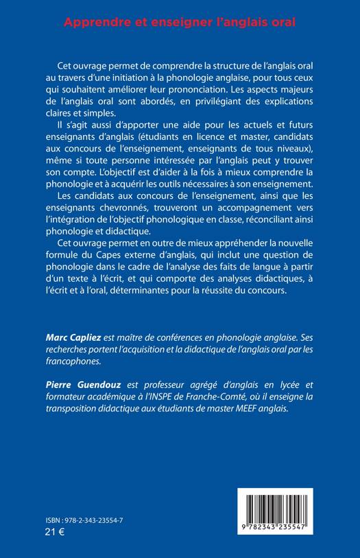 Cet ouvrage permet de comprendre la structure de l’anglais oral au travers d’une initiation à la phonologie anglaise, pour tous ceux qui souhaitent améliorer leur prononciation. Les aspects majeurs de l’anglais oral sont abordés, en privilégiant des explications claires et simples. Il s’agit aussi d’apporter une aide pour les actuels et futurs enseignants d’anglais, même si toute personne intéressée par l’anglais peut y trouver son compte. L’objectif est d’aider à la fois à mieux comprendre la phonologie et à acquérir les outils nécessaires à son enseignement. Les candidats aux concours de l’enseignement, ainsi que les enseignants chevronnés, trouveront un accompagnement vers l’intégration de l’objectif phonologique en classe, réconciliant ainsi phonologie et didactique. Cet ouvrage permet en outre de mieux appréhender la nouvelle formule du Capes externe d’anglais, qui inclut une question de phonologie dans le cadre de l’analyse des faits de langue à partir d’un texte à l’écrit, et qui comporte des analyses didactiques, à l’écrit et à l’oral, déterminantes pour la réussite du concours.