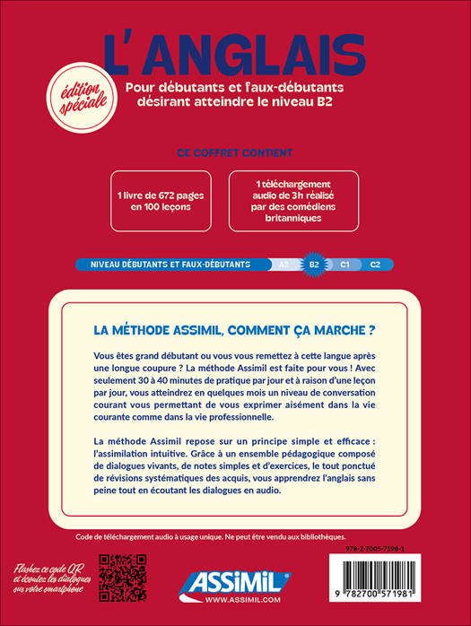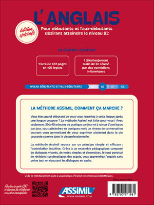 La méthode Assimil repose sur un principe simple et efficace : l'assimilation intuitive. Grâce à un ensemble pédagogique composé de dialogues vivants, de notes simples et d'exercices, le tout ponctué de révisions systématiques des acquis, vous apprendrez l'anglais sans peine tout en écoutant les dialogues en audio.