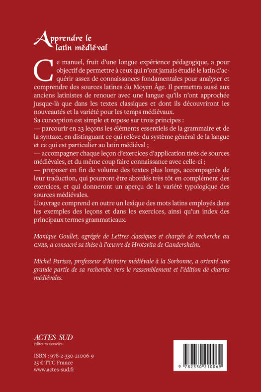 Ce manuel, fruit d'une longue expérience pédagogique, a pour objectif de permettre à ceux qui n'ont jamais étudié le latin d'acquérir assez de connaissances fondamentales pour analyser et comprendre des sources latines du Moyen Âge. Vingt-trois leçons présentent les éléments essentiels de la grammaire et de la syntaxe, chacune accompagnée d'exercices d'application tirés de sources médiévales. Cet ouvrage, indispensable, comprend en outre un lexique des mots latins employés dans les exemples des leçons et dans les exercices, ainsi qu'un index des principaux termes grammaticaux.