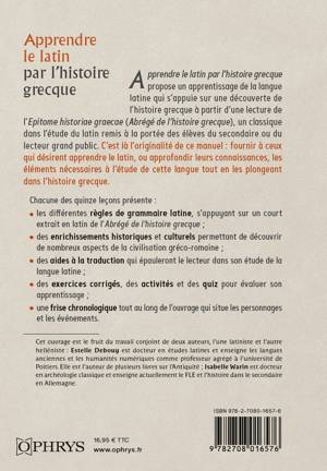 Apprendre le latin par l’histoire grecque propose un apprentissage de la langue latine qui s’appuie sur une découverte de l’histoire grecque à partir d’une lecture de l’Epitome historiae graecae (Abrégé de l’histoire grecque), un classique dans l’étude du latin publié au début du XIXe siècle. L’originalité de ce manuel réside dans l’approche proposée : il s’agit à la fois de fournir tous les éléments nécessaires à l’étude de la langue latine tout en permettant de découvrir les épisodes les plus célèbres de l’histoire grecque.