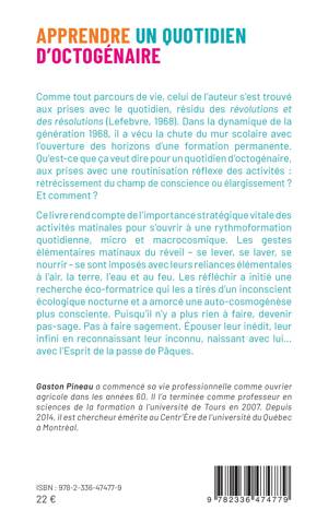 Comme tout parcours de vie, celui de l'auteur s'est trouvé aux prises avec le quotidien, résidu des révolutions et des résolutions (Lefebvre, 1968). Dans la dynamique de la génération 1968, il a vécu la chute du mur scolaire avec l'ouverture des horizons d'une formation continue à tous les âges et secteurs de la vie. Qu'est-ce que ça veut dire pour un quotidien d'octogénaire, aux prises avec une routinisation réflexe des activités quotidiennes et une ouverture du champ de conscience au rythme cosmique des jours et des nuits ? Ce livre rend compte de l'importance stratégique vitale des activités matinales pour s'ouvrir à une rythmoformation quotidienne, micro et macrocosmique. Les gestes élémentaires matinaux du réveil - se lever, se laver, se nourrir - se sont imposés avec leurs liaisons élémentales à l'air, la terre, l'eau et au feu. Les réfléchir a initié une recherche éco-formatrice qui les a tirés d'un inconscient écologique nocturne et a amorcé une auto-cosmogénèse plus consciente.