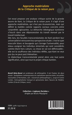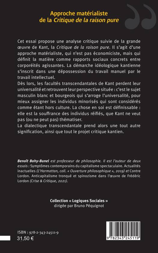Cet ouvrage propose une analyse critique suivie de la grande oeuvre de Kant, la Critique de la raison pure. Il s’agit d’une approche matérialiste, qui n’est pas économiciste, mais qui définit la matière comme rapports sociaux concrets entre corporéités agissantes. La démarche idéologique kantienne s’inscrit dans une dépossession du travail manuel par le travail intellectuel. Dès lors, les facultés transcendantales de Kant perdent leur universalité et retrouvent leur perspective située : c’est le sujet masculin blanc et bourgeois qui s’arroge l’universalité, pour mieux assigner les individus minorisés qui sont considérés comme étant hors culture. La chose en soi est définissable : elle est la souffrance des individus réifiés, que Kant ne veut pas (ou ne peut pas) thématiser. La dialectique transcendantale prend alors une tout autre signification, ainsi que tout le projet critique kantien.