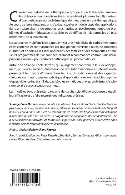 Alors que de nombreux programmes innovants de tmf ont fait leur apparition en France et dans le monde au cours des quinze dernières années, il était important de rendre compte de ses avancées théoriques et cliniques qui concernent de nombreuses pathologies, problématiques, tranches d’âge, contextes de soins et de prévention. En lien direct avec cette explosion clinique, les efforts de systématisation des protocoles de tmf et de recherche se sont intensifiés et contribuent à légitimer et pérenniser cette approche thérapeutique en améliorant la compréhension de ses bénéfices et indications spécifiques. Autour de l’auteur, plusieurs cliniciens-chercheurs de réputation nationale et internationale, chacun spécialisé dans un domaine spécifique d’application des tmf : troubles psychiatriques, violence intrafamiliale, pathologies somatiques graves, problèmes d’exclusion scolaire et sociale, traumatismes…, présentent leur cadre d’intervention, leurs outils spécifiques, et des vignettes cliniques.