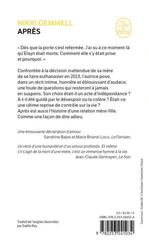 Confrontée à la décision inattendue de sa mère de se faire euthanasier en 2015, l’autrice pose, dans un récit intime, honnête et éblouissant d’audace, une foule de questions qui resteront à jamais en suspens. Son choix était-il un acte d’indépendance ? A-t-il été guidé par le désespoir ou la colère ? Était-ce une ultime reprise de contrôle sur la vie ? Après est aussi l’histoire d’une relation mère-fille. Comme une façon de dire adieu.