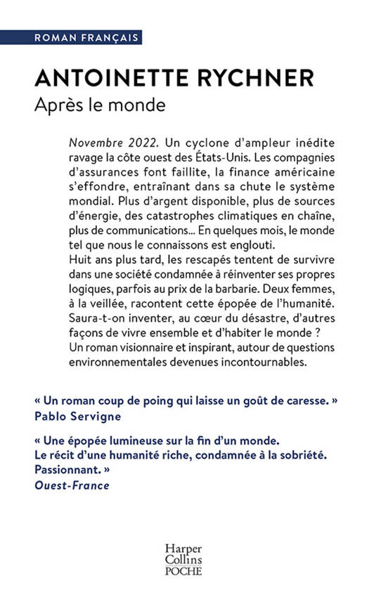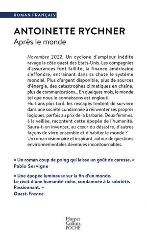 Novembre 2022. Un cyclone d’ampleur inédite ravage la côte ouest des États-Unis. Les compagnies d’assurances font faillite, la finance américaine s’effondre, entraînant dans sa chute le système mondial. Plus d’argent disponible, plus de sources d’énergie, des catastrophes climatiques en chaîne, plus de communications…. En quelques mois, le monde tel que nous le connaissons est englouti. Huit ans plus tard, les rescapés tentent de survivre dans une société condamnée à réinventer ses propres logiques, parfois au prix de la barbarie. Deux femmes, à la veillée, racontent cette épopée de l’humanité. Saura-t-on inventer, au coeur du désastre, d’autres façons de vivre ensemble et d’habiter le monde ? Un roman visionnaire et inspirant, autour de questions >environnementales devenues incontournables.